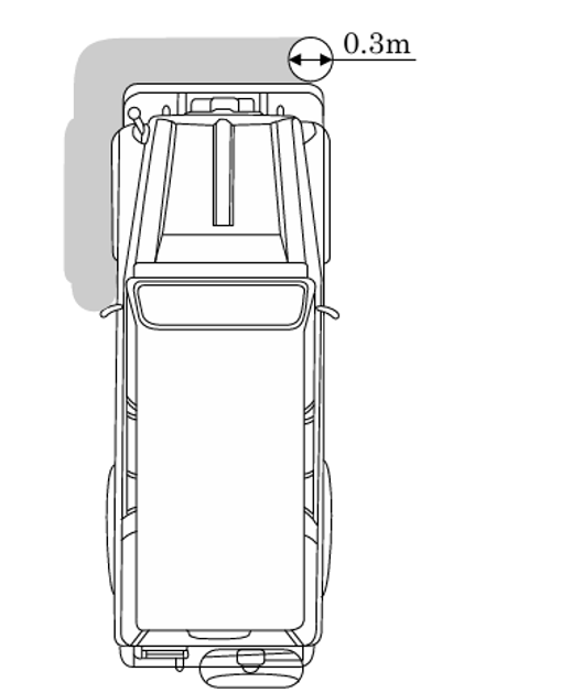 自動車には、運転者が運転者席において、下図のグレー部分の範囲内において障害物(縦1m、幅0.3m)を確認できる鏡その他の装置を備えなければならない。