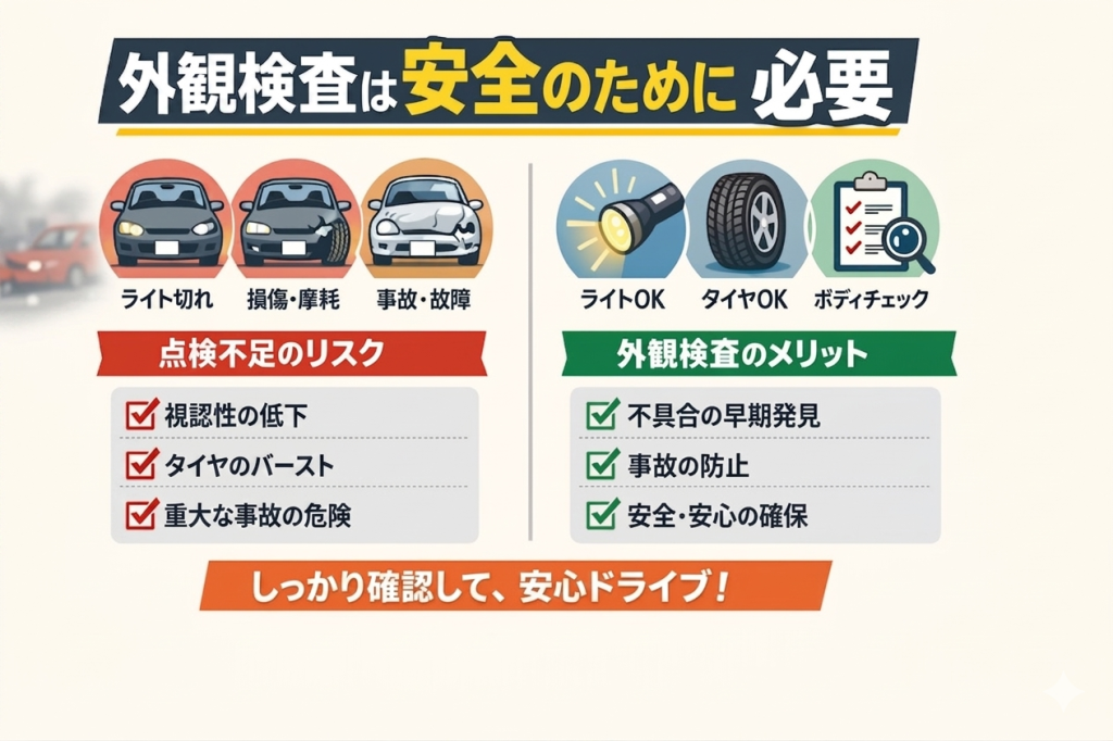 - 主なチェックは「ライト・車体・タイヤ・ガラス」