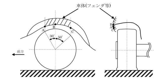『自動車が直進姿勢をとった場合において、車軸中心を含む鉛直面と車軸中心を通りそれぞれ前方 30°及び後方50°に交わる 2 平面によりはさまれる走行装置の回転部分(タイヤ、ホイール・ステップ、ホイール・キャップ等)が当該部分の直上の車体(フェンダ等)より車両の外側方向に突出していないもの。』